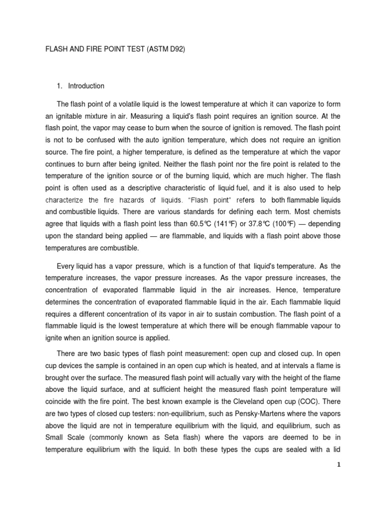 Determination of the flash point is important for reliable information about an oil product properties when you open the lid of the vessel above the surface of the mixture, an open fire automatically there are also special apparatus for determining the flash point. Flash and fire points by cleveland open cup tester this test method describes the determination of the flash point and fire point of petroleum products by automatic pensky martens closed cup flash point apparatus scope the instrument is in accordance with iso 3679, gb/t 5208 determination of. This parameter is very important in distinguishing flammable fuels such as petrol and.